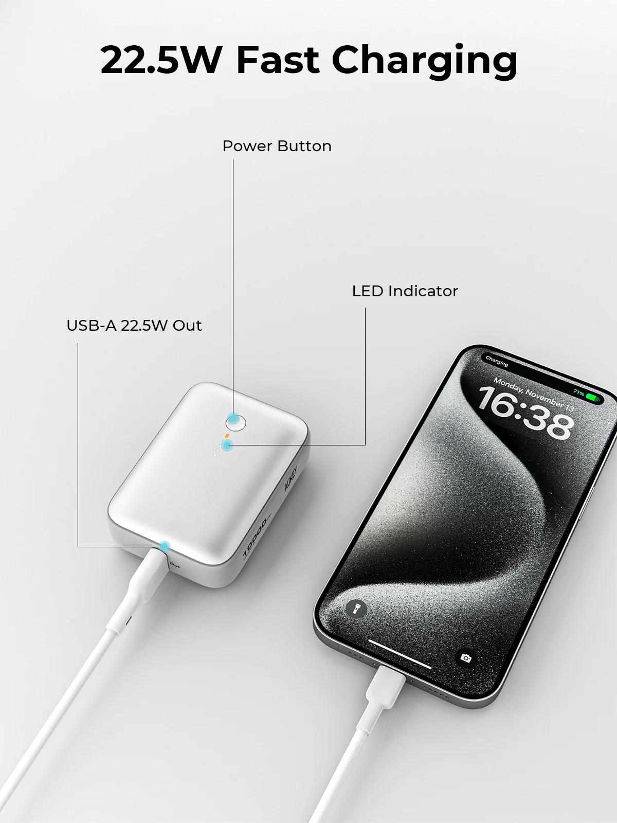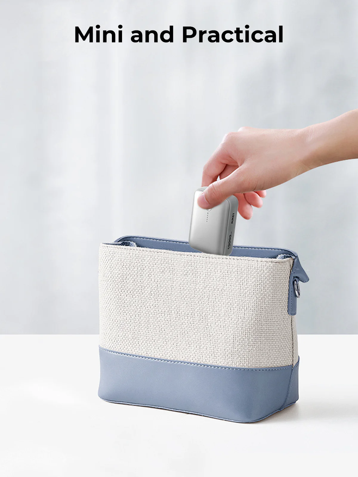 - One of the smallest and lightest 10,000mAh portable charger. It’s compact and smooth design fits comfortably into the palm of your hand and the minimalist LED indicator shows the remaining power at a glance