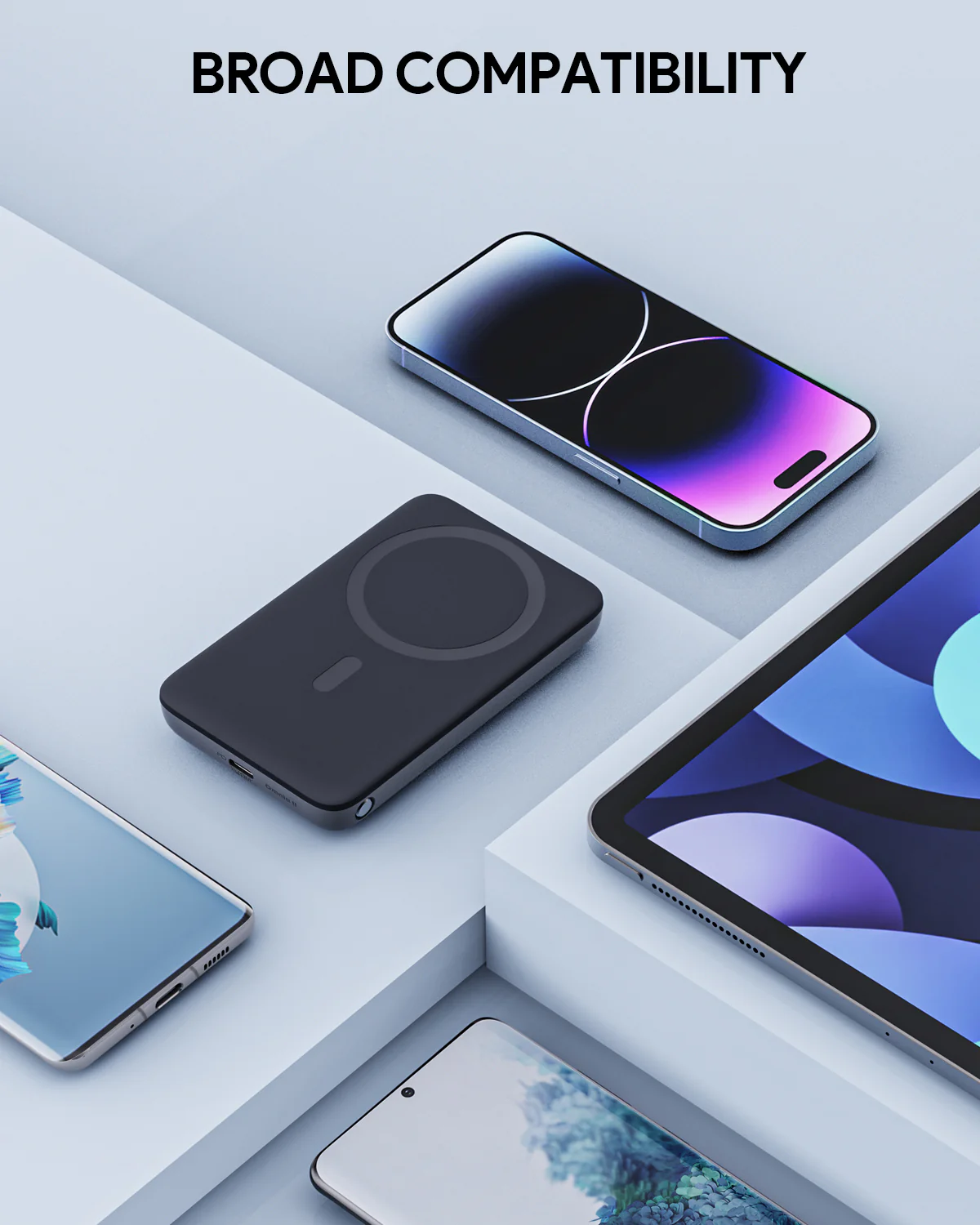- MagSafe Compatibility: Designed specifically for the latest iPhone models, with strong built-in magnets, the power bank firmly attaches to the back of iPhone, ensuring a secure and efficient wireless charging connection every time.
