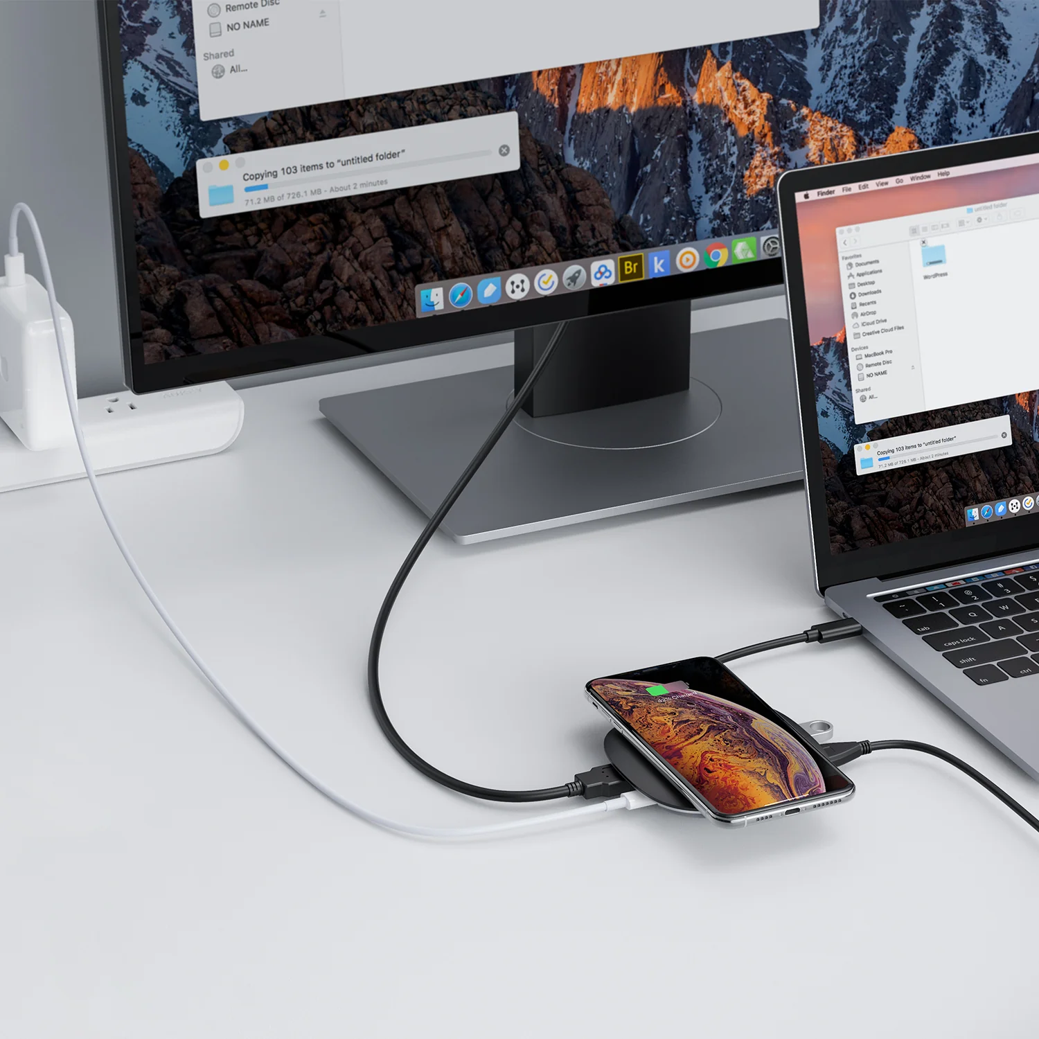 Multitask Like a Pro, Unity Wireless 100W, A Mini Data, Video, and Power Transfer Station: 4-in-1 Type-C hub and wireless charger wirelessly fast charges Qi-compatible devices.-