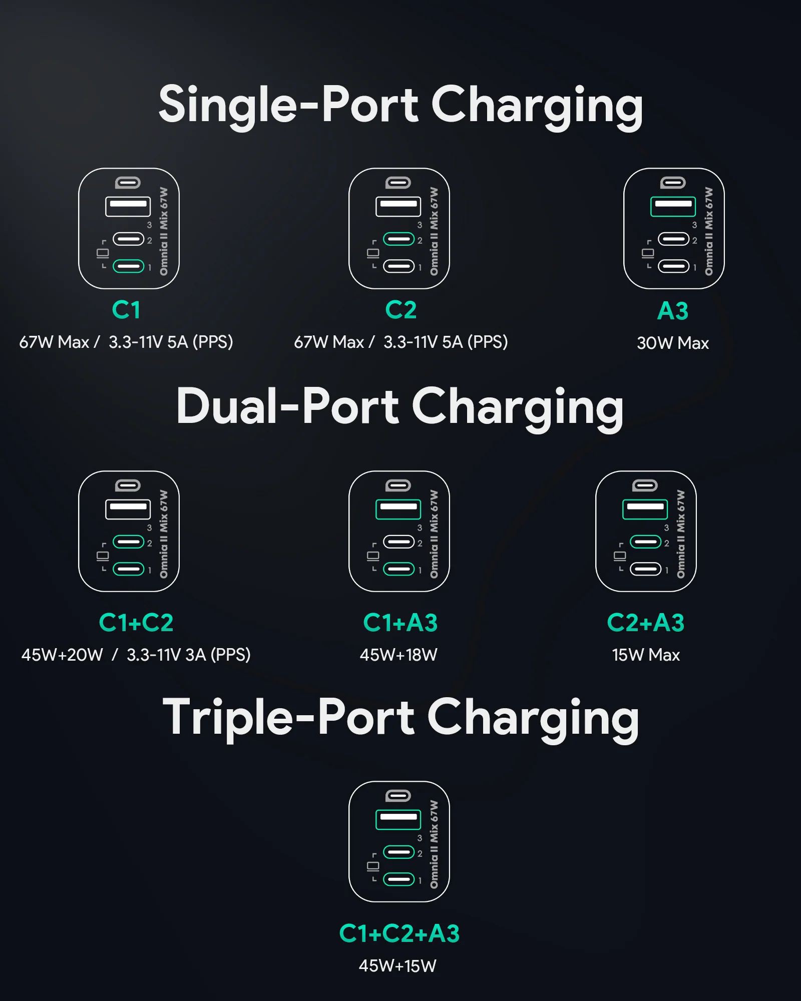 • USB-C1 + USB-C2+USB-A Output: 45W+15W (60W Max)